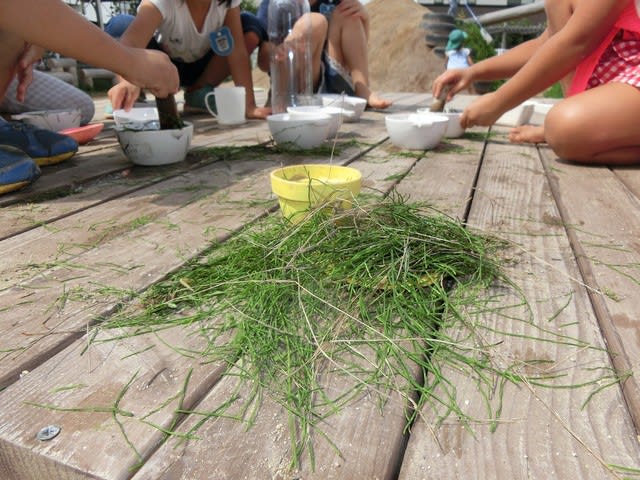 スギナをすりつぶして「お茶ができましたよ~!」「冷たいお茶はいかがですか~?」とお茶屋さんごっこが広がっていました☆