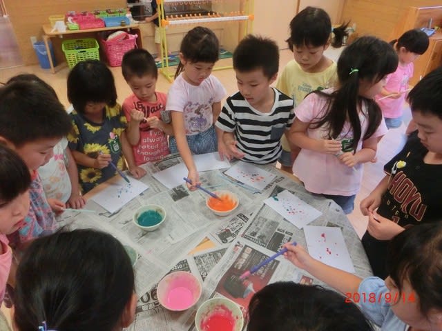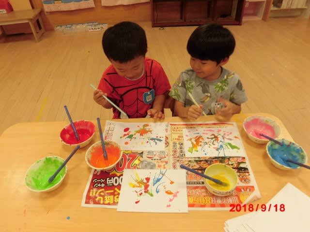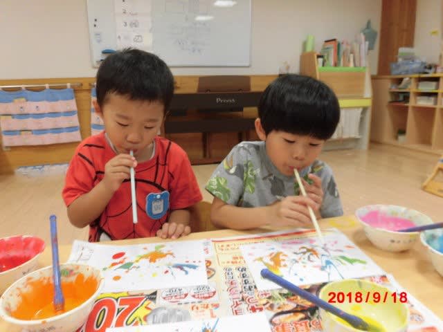 クラスカラーの黄色、赤、オレンジ、ピンク、青、緑の6色を使って吹き絵をしました。