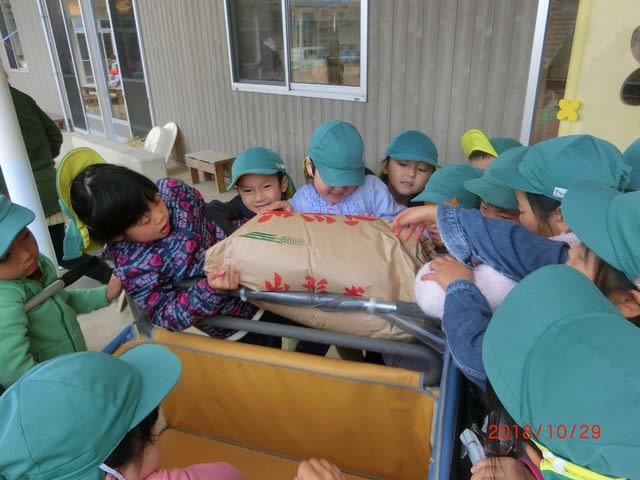 「自分達で運ぶ!」とはりきる5歳児きらきら組さん。何でお米を運ぶか、