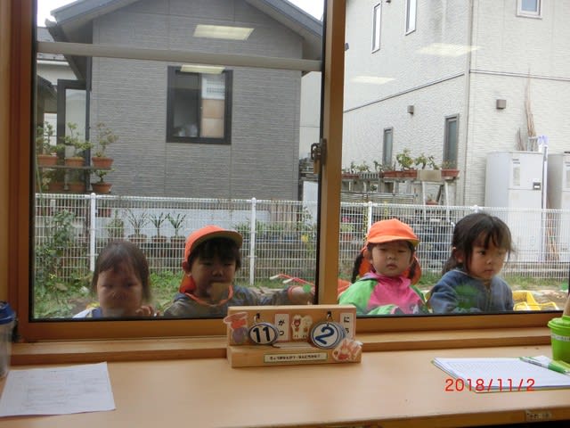 楽しそうに活動している様子を窓から覗く2歳児の子ども達・・・
