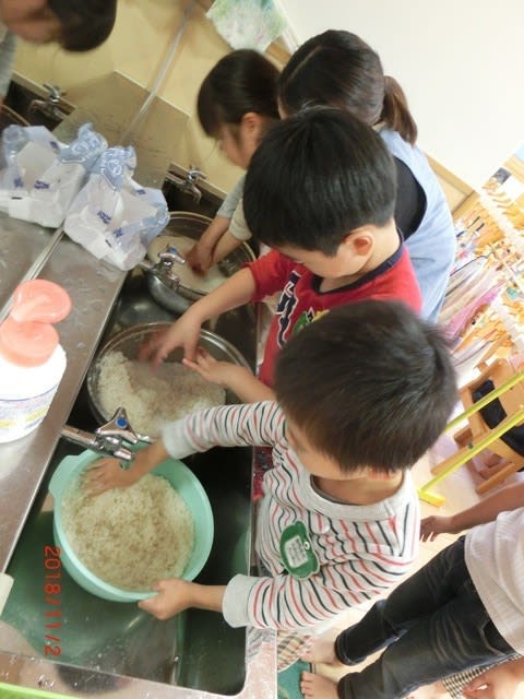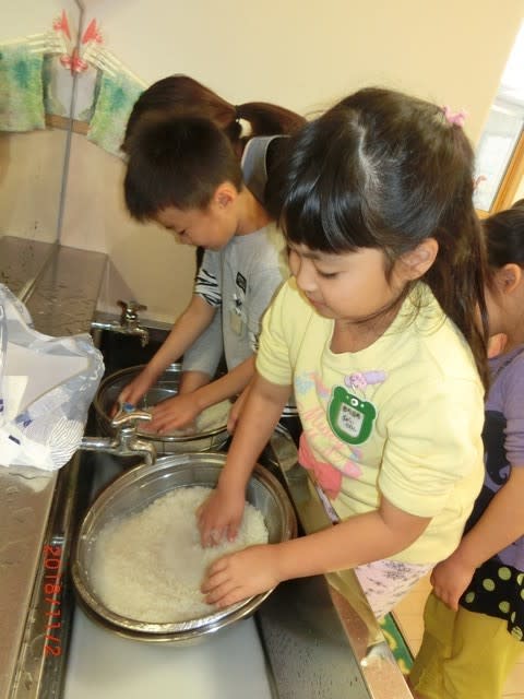 自分達でお米をとぎ炊飯器へ。次第にお部屋には、いい匂いが漂ってきました(^^♪