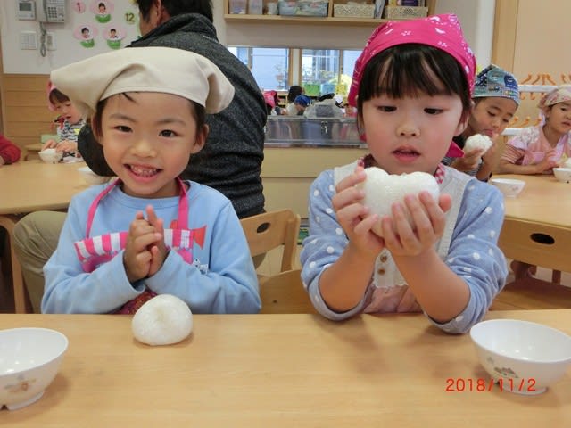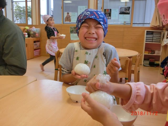 「いただきま~す」元気な声が響き、真っ先におにぎりをほおばる子ども達。