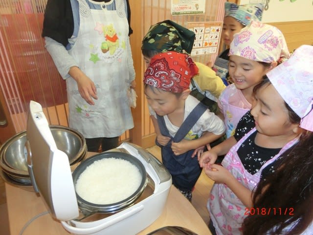 「うわぁ~!いいにおい!!」炊きたてのご飯に皆の顔もほころびます☆