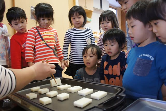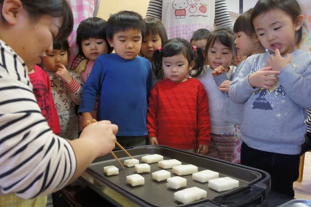 美味しそうな匂いと、膨らむお餅を目の前に待ちきれなくなってきた子ども達は、