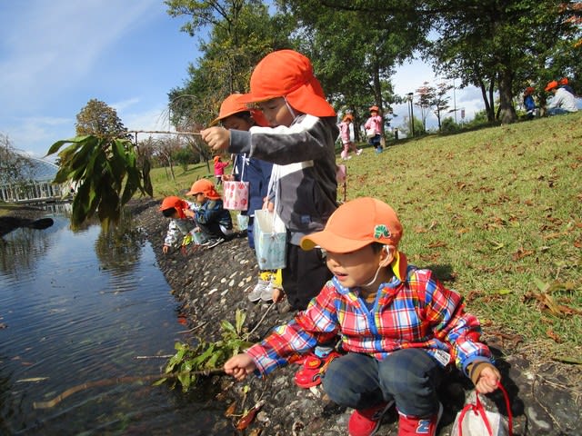 「葉っぱ釣れたよ~!」「お魚逃げて捕まえられないね~」