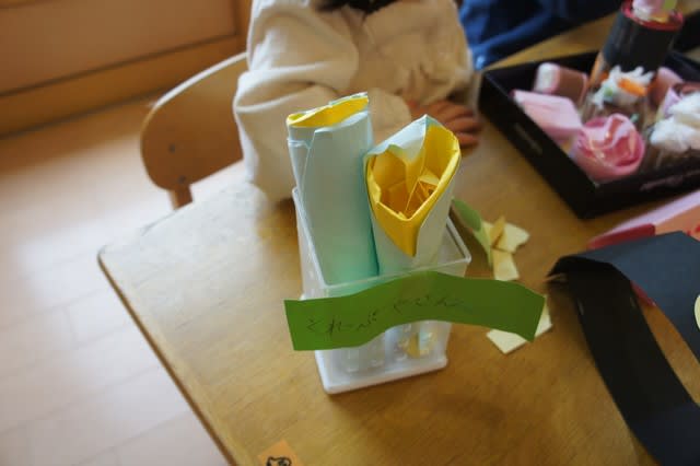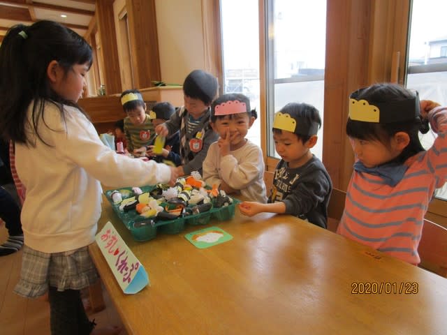 そんな中、お正月も過ぎた頃、お休み中に食べたお寿司を思い出したのか、紙を丸めたり、ちぎったりしながら・・・