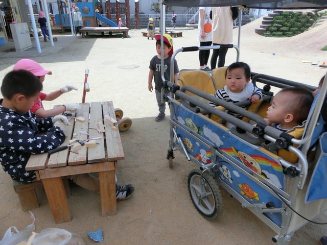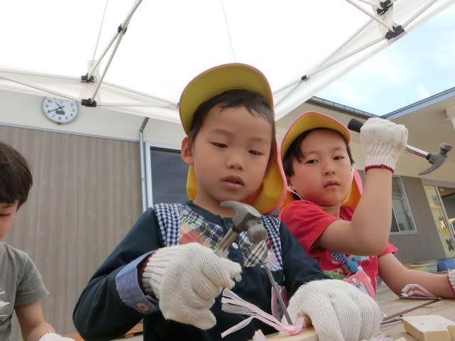 どの子も真剣な眼差しで釘を打ち付け、大工さんごっこを楽しんでいるようでした!