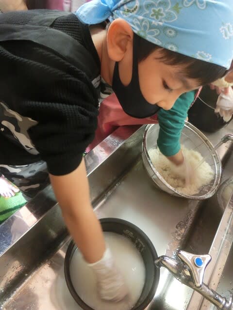 水の冷たさにもめげずにお米を研ぐ子ども達。