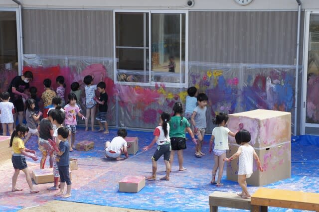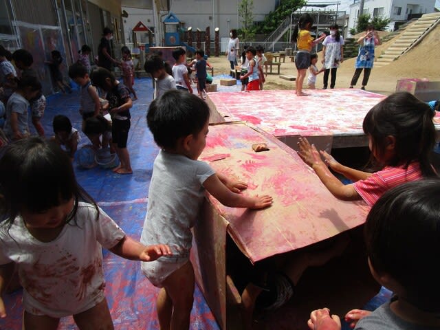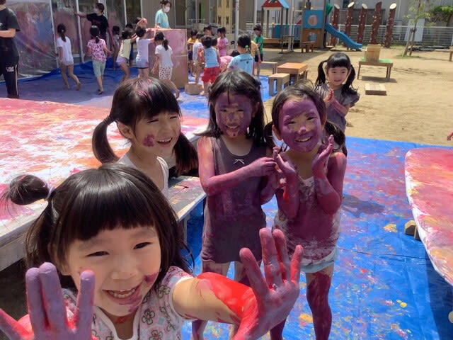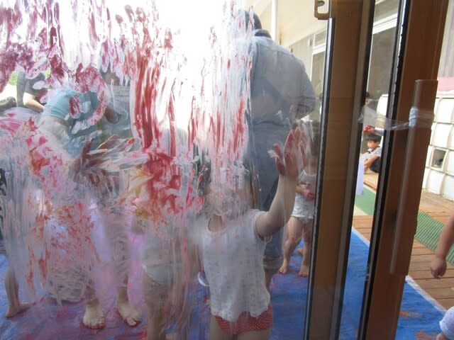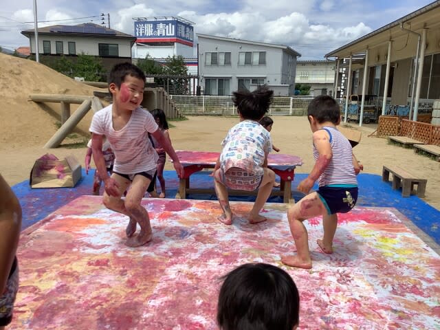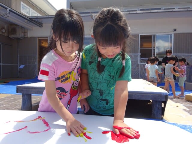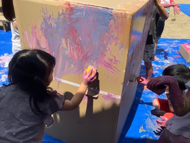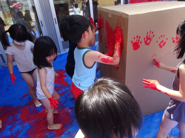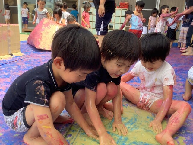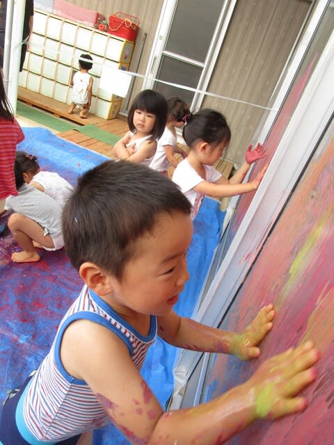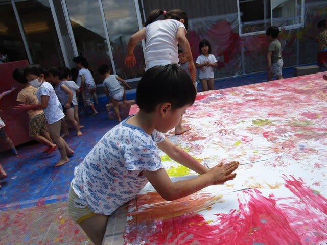 絵の具を手足や身体に付けて、自由にペインティングを楽しみます。