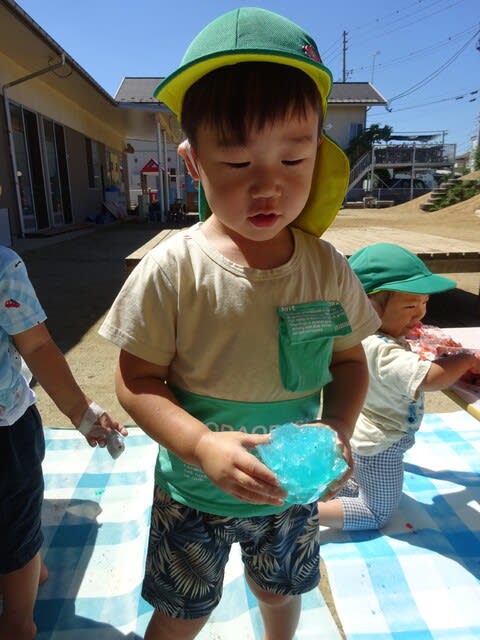 手に付いた寒天をみせてくれるなど遊びを広げる中で、様々な気付きが生まれてきます。