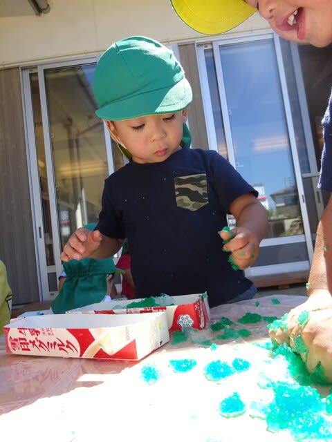 そして、繰り返す中で、友達と違う色の寒天を混ぜて、お料理ごっこをたのしんだり、