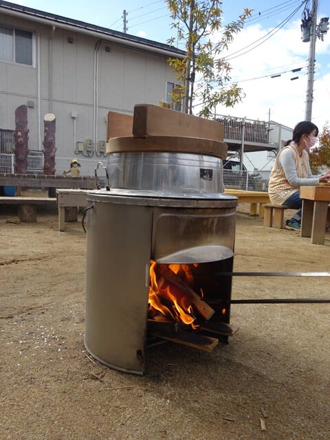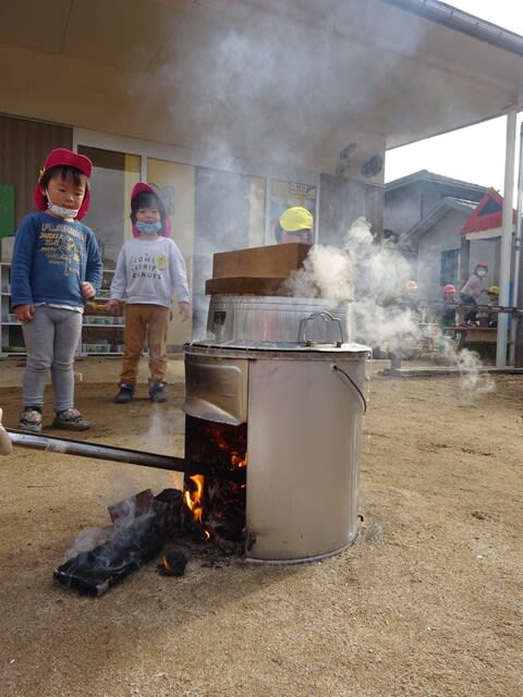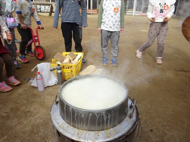 匂いに誘われて、羽釜の周りに子ども達が集まります。