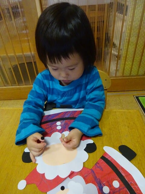 1歳児のお友達は、サンタクロースの顔にシールを貼りました。