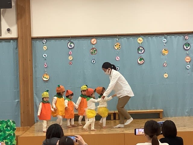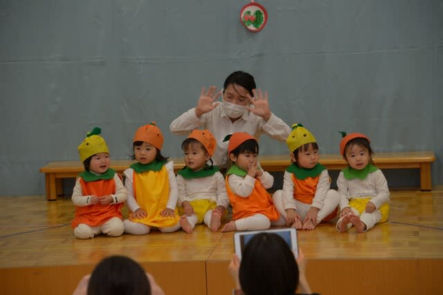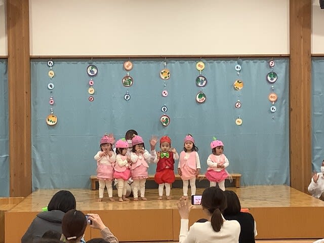 1歳児のお友達は大好きな絵本「くだものみいつけた」を題材に、子ども達が果物に変身し、登場しました。