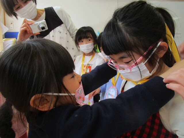 「ありがとう!」の言葉を添えて、年長組のお兄さん、お姉さんにメダルをかけました。