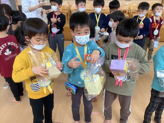 会が始まる前に、3歳児クラスから手作りのメダルのプレゼントがありました。
