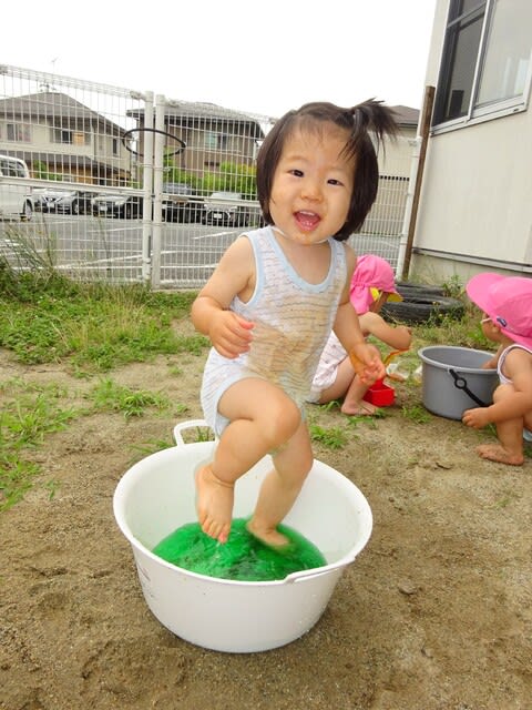 ドブン!とたらいの中に入り、緑色の水しぶきを楽しんだり、