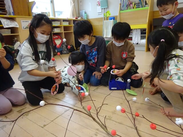 今年もまた、各保育室の前に色とりどりの団子木を飾りました。
