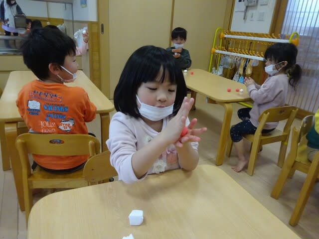 慣れた手つきで、赤や白の紙粘土を丸め、