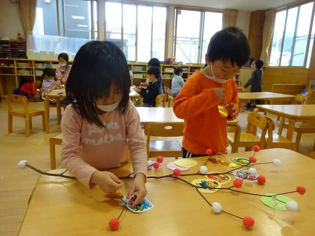お団子も付け終わると、今度はふなせんべいや折り紙などでミズキの木を彩ります。