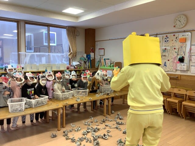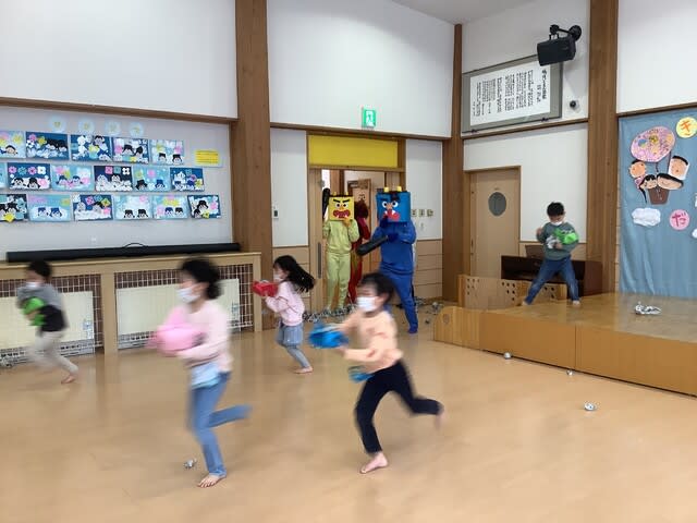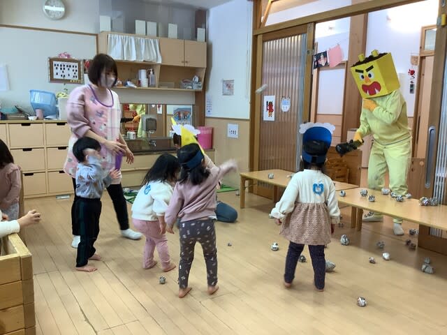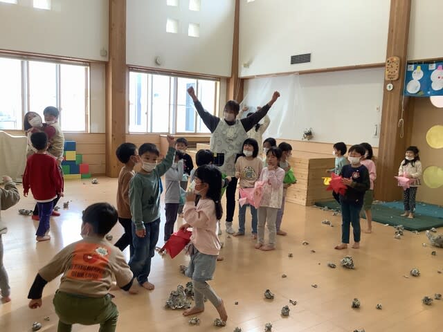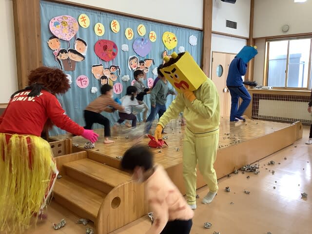 びっくりして泣き出してしまう子、負けずに豆に見立てた新聞紙をまく子、驚いて隠れる子がいたりと大騒ぎ!