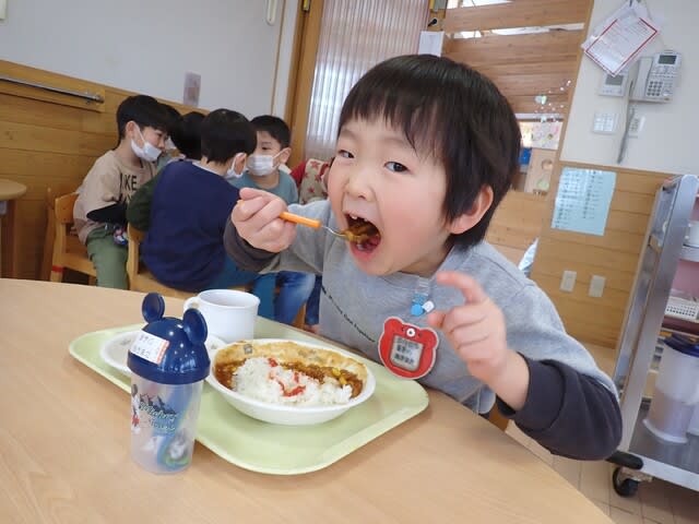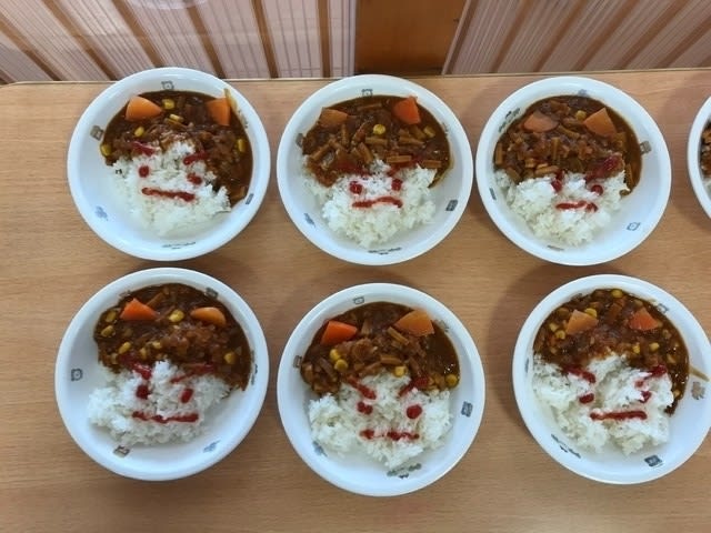 今日の給食は節分の特別メニュー、野菜たっぷり鬼カレーと鬼に金棒つくねです。