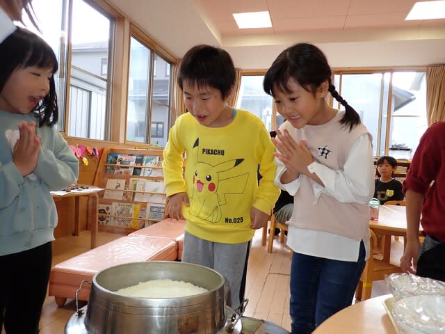 「つやつや、もちもち~!」「いいかおり♡」とご飯の香りをかいでいきます。