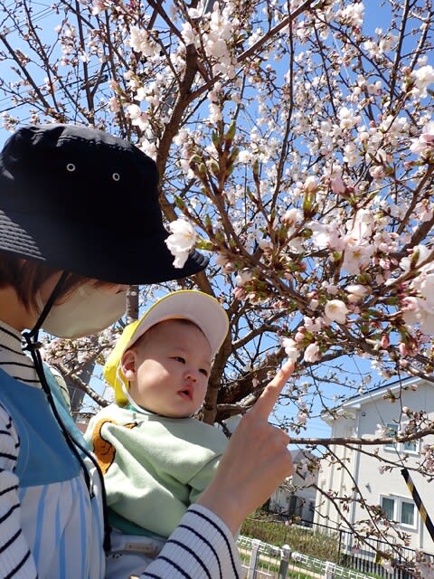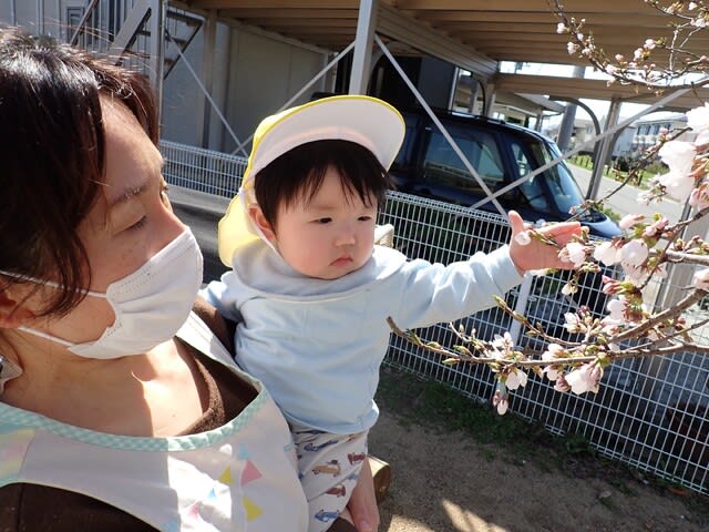 今日は、園庭に出て桜の花見です。「桜のお花きれいだね~。花びらかわいいね~、〇ちゃん」等と話しています。
