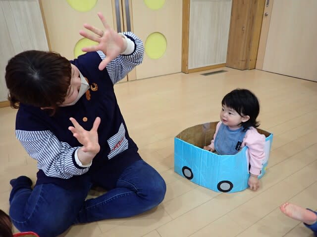段ボールの車の乗り心地がよいようですね。先生の「ばぁー!」にほっとし、笑顔がみられました。