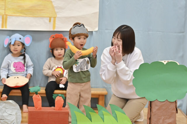 そして、動物になりきったお友達は、元気にジャンプをしたり、また大好きな食べ物を見つけて食べる真似をしたり・・・