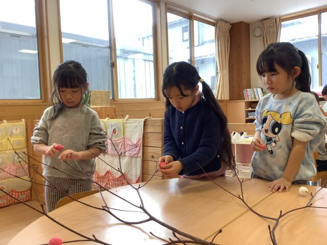 大きなミズキの木がお部屋に届くと、「あ!おだんごつけるんだよね!」と昨年のことを思い出し、話をしてくれる子もいました。
