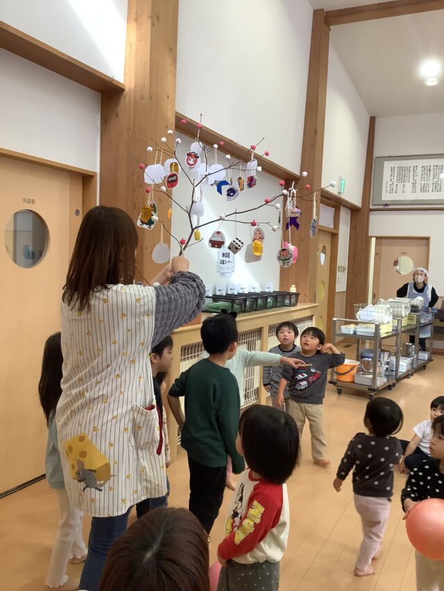 小さい組さんもきれいな飾りがついた団子木に興味津々!