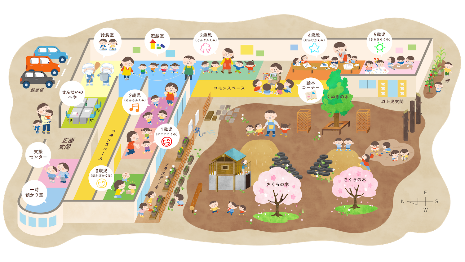 それぞれの遊びに適したいくつかのコーナーに分かれており、自分で遊びたいものを見つけたり、遊びに集中したりすることができます。また、各学年の保育室とつながっていることで、異年齢児との関わりや交流が持てます。