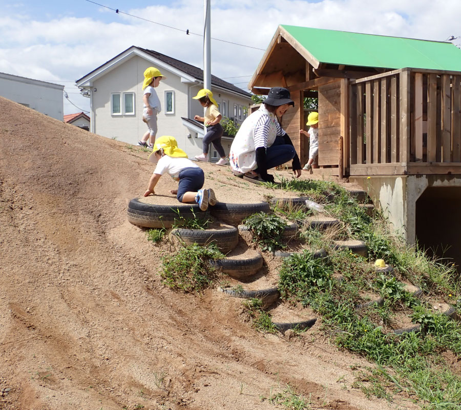 園庭の真ん中に大きな山が二つあり、様々な場所で挑戦できる空間となっています。また、泥や水などの感触を味わいながら、心も身体も解放的になって楽しんでいます。