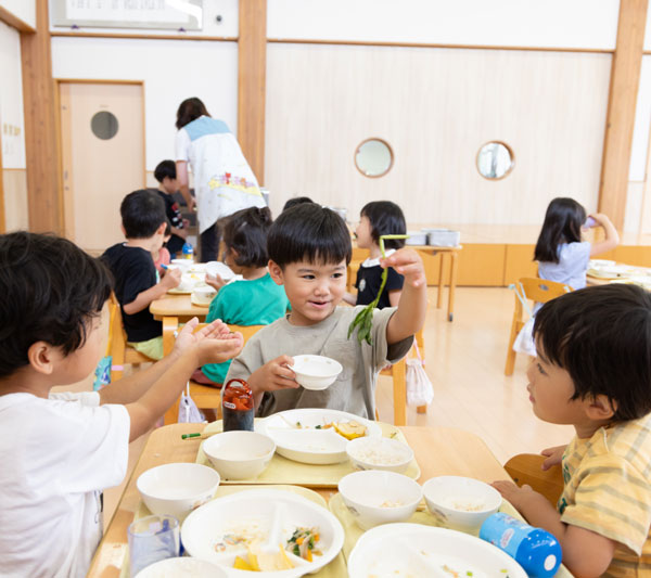 心と体の栄養となる食事(給食)は安心・安全な旬の食材を提供し、毎日の「おいしいね!」を大切にしています。また様々な作物の種や苗を育て、収穫して、おいしく食べる体験や、皮むきなどをして給食づくりのお手伝いをしています。